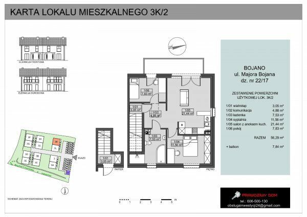 dwie sypialnie (11,56m2 oraz 7,83m2), łazienka (7,53m2), wiatrołap z